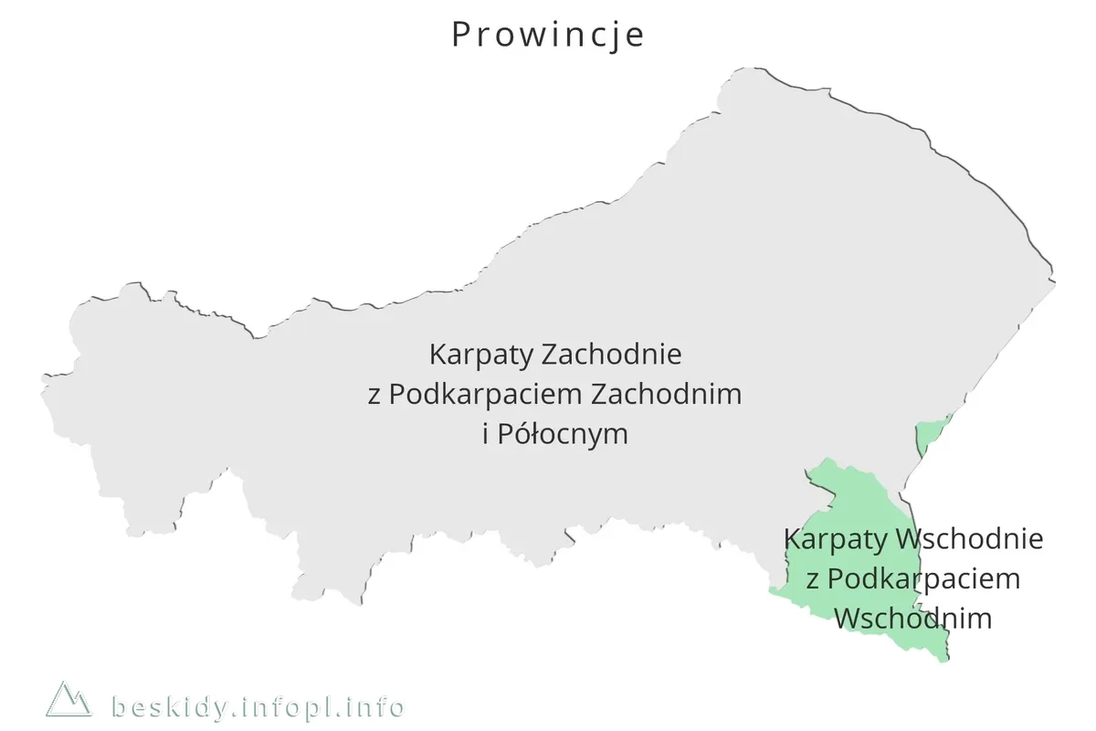 Beskidy Zachodnie i Beskidy Środkowe należą do podprowincji Zewnętrznych Karpat Zachodnich, a Beskidy Lesiste do Beskidów Wschodnich. Obydwie podprowincje wchodzą w skład prowincji Karpaty Zachodnie z Podkarpaciem Zachodnim i Północnym oraz w skład prowincji Karpaty Wschodnie z Podkarpaciem Wschodnim. Podprowincje natomiast tworzą Region Karpacki, będący jednym z trzech megaregionów Polski.